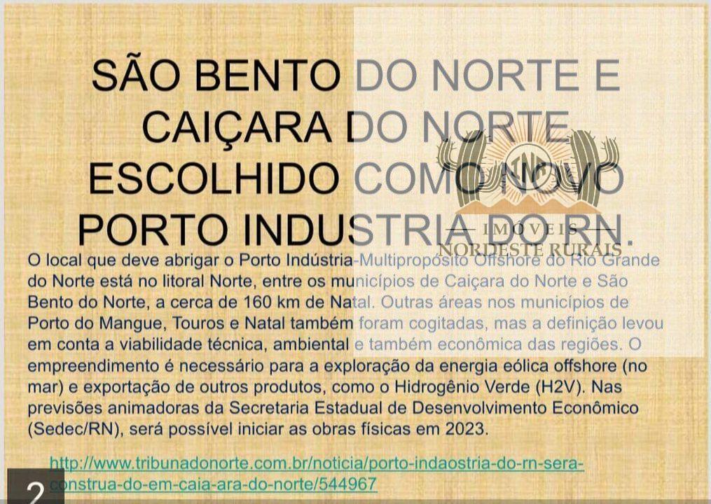 Além disso, a instalação do novo cais nas proximidades promete transformar a região em um polo de desenvolvimento econômico e turístico. Isso significa que, ao investir nesta área, você estará à frente de uma tendência de crescimento, garantindo um retorno financeiro significativo e sustentável. Não perca a chance de fazer parte deste futuro promissor. Esta é a oportunidade de transformar um terreno de 79 hectares em um empreendimento de sucesso, em uma das regiões mais belas e promissoras do Rio Grande do Norte. Invista em São Bento do Norte e colha os frutos de um investimento inteligente e visionário.